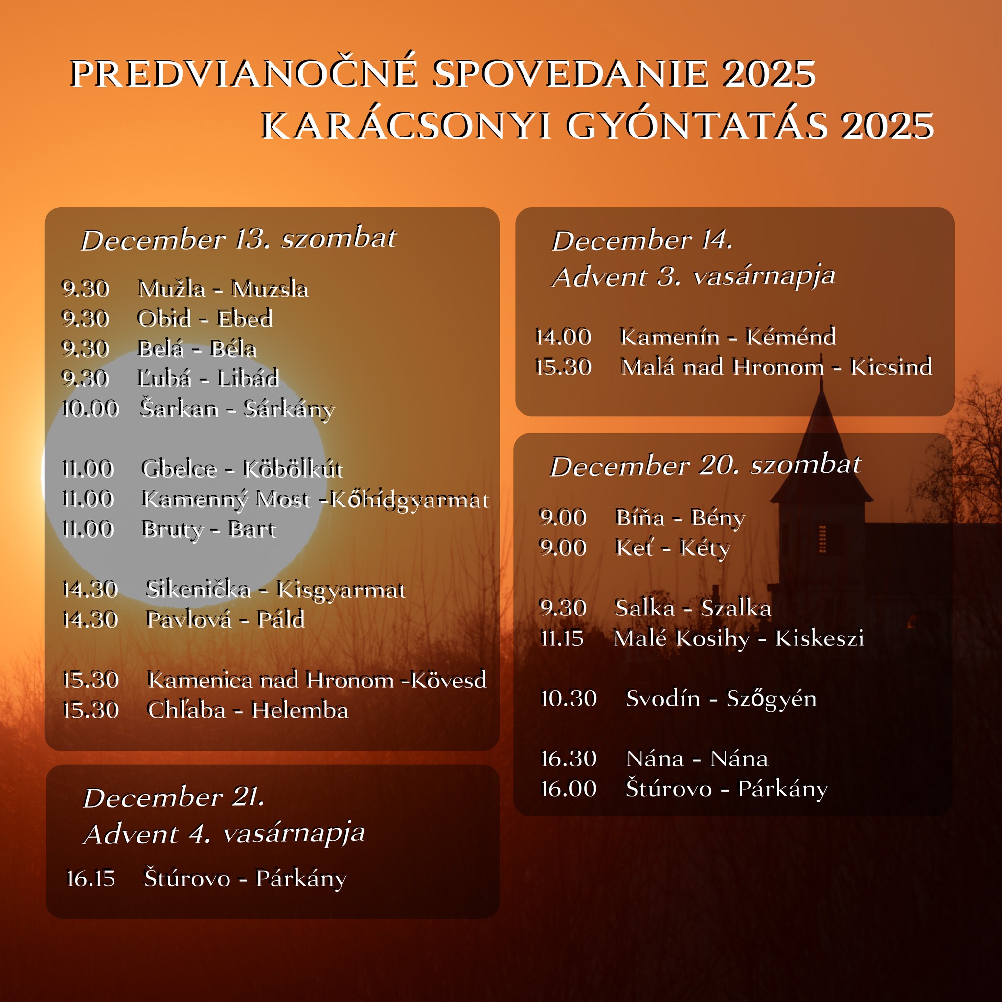 Prvé sv. prijímanieV rámci školskej katechézy sa už prebieha príprava detí na prvé sv. prijímanie. Od januára začíname aj farské katechézy. Prevzatie prihlášok na prvé sv. prijímanie je možné po sv. omšiach v kostole alebo u katechétu. Odovzdať ich treba najneskôr do 21. decembra 2025 po sv. omši kňazovi v sakristii alebo u katechétu.