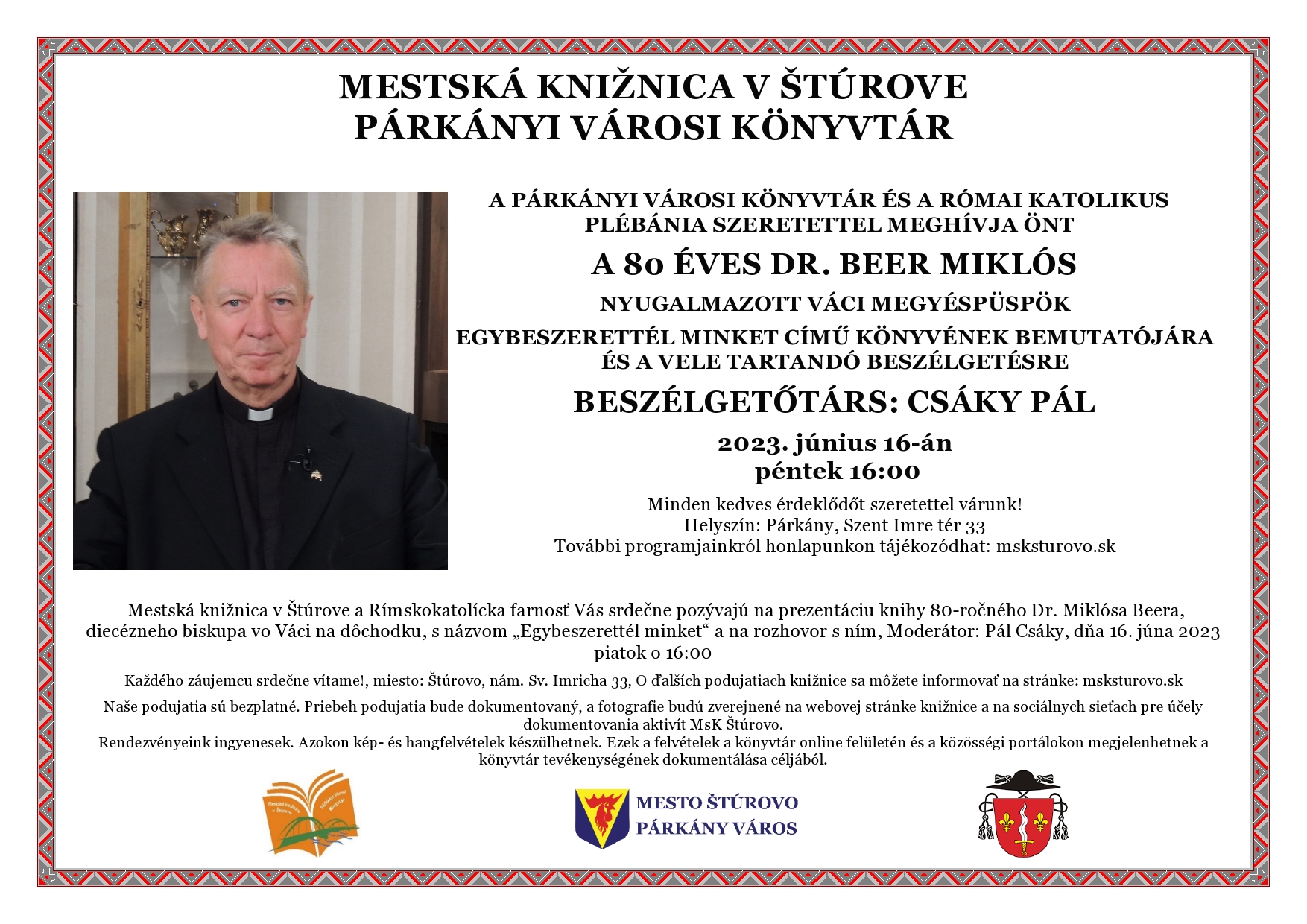 Beszélgetés a 80 éves dr. Beer Miklós püspökkelPlébániánk a Városi Könyvtárral karöltve szeretettel hív mindenkit dr. Beer Miklós nyugalmazott váci megyéspüspök Egybeszerettél minket című könyvének bemutatójára és püspök úrral tartandó beszélgetésre, amely június 16-án 16.00 órai kezdettel a Párkányi Városi Könyvtárban kerül megrendezésre. Az est moderátora Csáky Pál. A könyvbemutató után az este 18.00 órakor kezdődő szentmisét Jézus Szentséges Szívének ünnepén a püspök úr celebrálja.