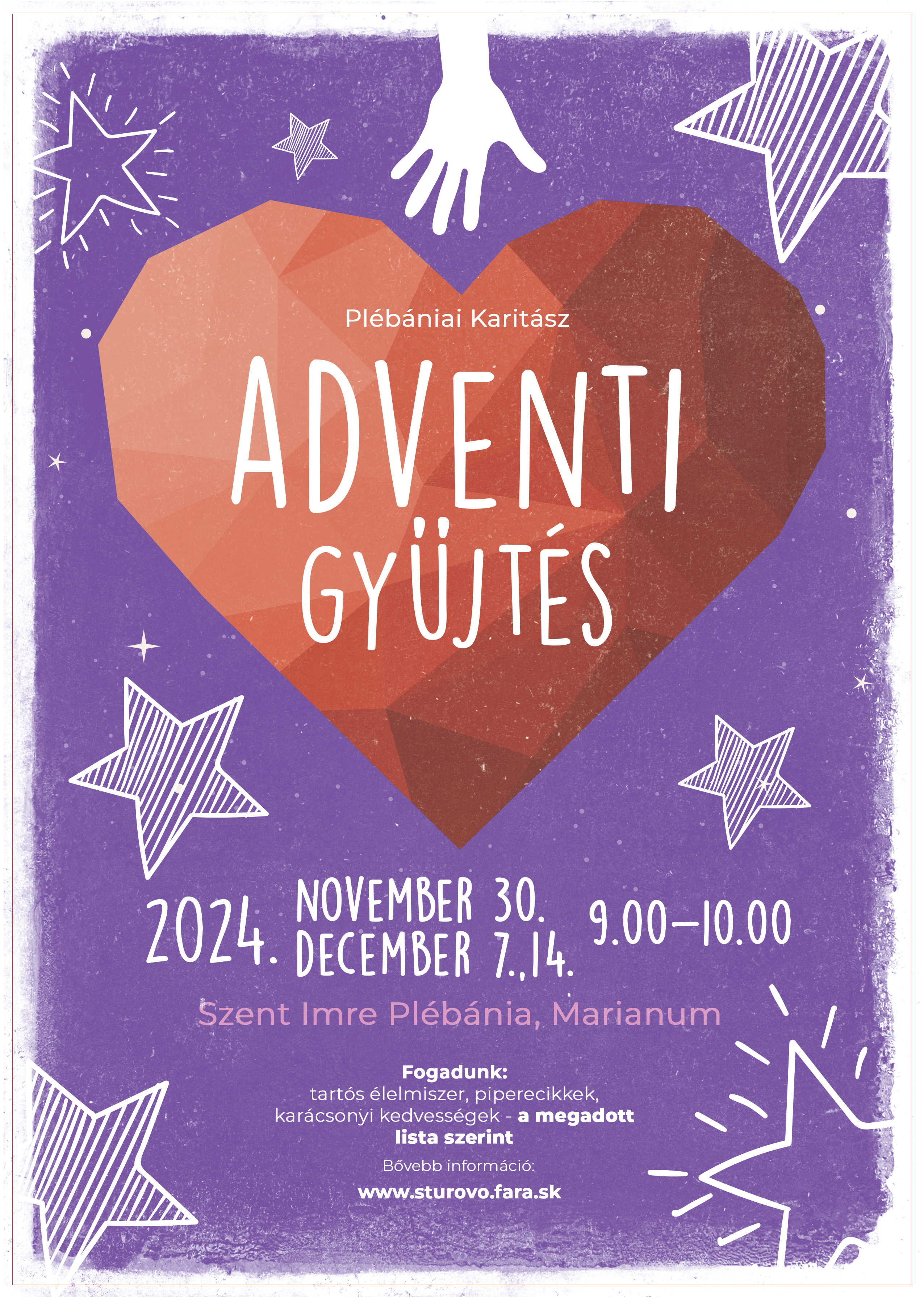 Idén is meghirdetjük a helyi karitászunk adventi gyűjtését Párkány és környéke szegényebb családjai részére. Tárgyi adományok közül higiéniai eszközöket, tartós élelmiszert és karácsonyi apróságokat fogadunk. Az adományokat november 30., december 7. és 14-én, 9.00 és 10.00 óra között lehet elhozni a plébániára.
